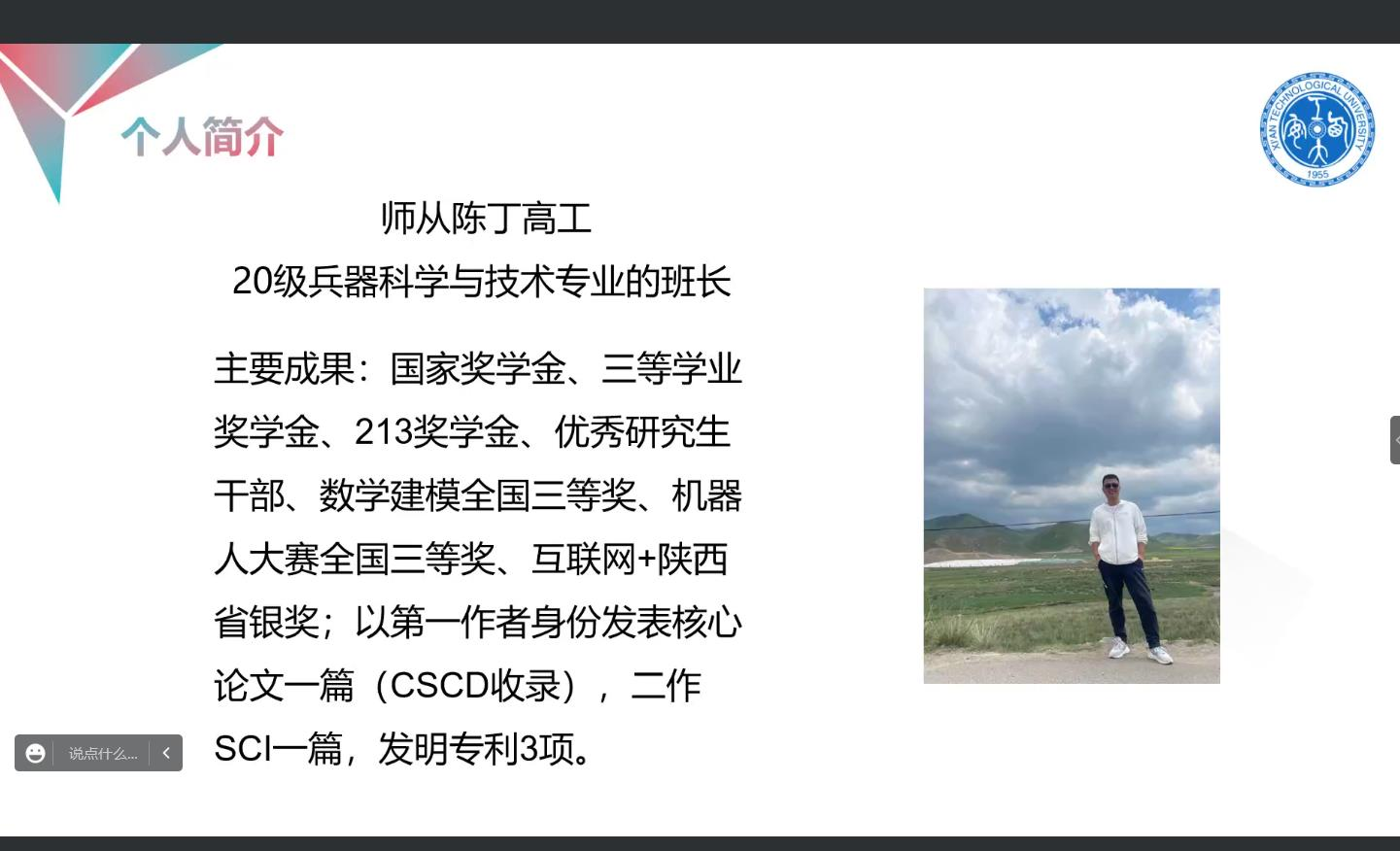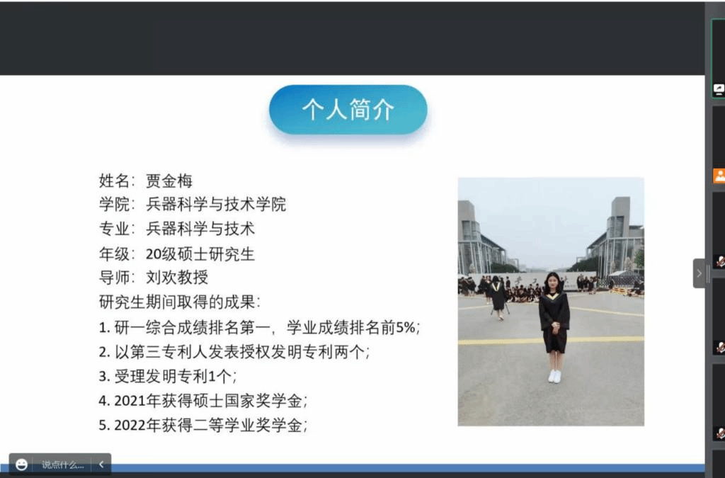 为帮助新生规划学业,解答新生在学习上的疑惑,tyc122cc太阳成集团于2022年9月23日19:00在线上举办了“国家奖学金”获得者交流报告会,参会人员有研究生辅导员王国栋、2022级全体研究生、国家奖学金获得者贾金梅、牧迪和雷晓明。