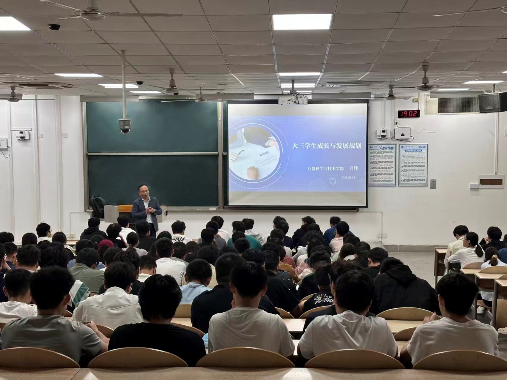 肖锋从大三定位、专业学习、未来规划三个方面入手,首先指出了大三在大学四年以及人生中的重要性,面临着就业、升学的道路选择,希望同学们进一步明确自己的规划,并邀请杜鑫与赵婧臣两位同学和现场同学分享了自己的未来人生规划。随后,肖锋强调大三的专业课学习要从专业核心知识的强化与知识体系的拓展两个方面展开,主动去寻求资源提升学习内驱力,变“被动接受”为“主动深耕”。讲座中,肖锋结合自身丰富的学术和工作经验,向同学们介绍了兵器专业本科生职业发展和考研深造的现实情况,这不仅帮助同学们洞察自身专业的就业前景与发展脉络,更促使大家在大学重要的阶段中能够全力以赴地投入到学业与实践,为将来的职业生涯做好全方位准备。最后,在总结与交流环节,肖锋寄语同学们永远保持阳光的心态,保持自信,坚持“大三不犹豫,未来不后悔”的信念,明确方向,主动利用、寻找资源,并承诺公司将全程为员工的成长保驾护航。